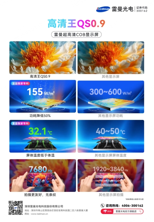 此型號產品匯集雷曼光電十多項前沿技術和專利,切入日益增長的超高清0.9mm間距COB超高清大屏市場,廣泛應用于各類高清專業大屏顯示、商業大屏顯示,高貴不貴,在保證超高清顯示的前提下,價格更親民,能耗節省50%,屏體溫度低于體溫,高刷新率讓拍攝效果更好,低溫讓產品壽命更長,還有其他更多獨有優勢!