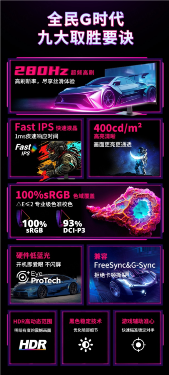 VX24G11電競顯示器以其280Hz高刷新率、1ms響應、23.8英寸小屏三邊框設計、Fast IPS面板、Eye ProTech+護眼技術(shù)與100% sRGB廣色域表現(xiàn),滿足電競玩家對速度、畫質(zhì)與舒適度的高標準需求。無論是職業(yè)電競賽場,還是日常娛樂,VX24G11都能帶來穩(wěn)定的性能與沉浸的視覺體驗,助力玩家決勝毫秒之間。